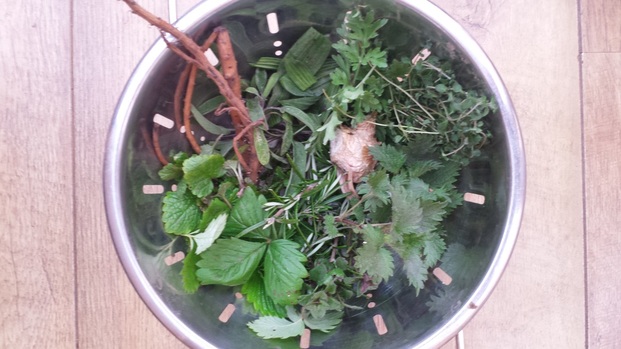 6 Nettle tops 3 sprigs of Thyme 3 Dandelion leaves 3 Strawberry leaves Small piece of Ginger Infuse in a cup of just boiled water for 10 minutes, strain and enjoy!